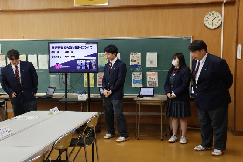 給食後には、本校で「課題研究」を履修している生徒4名が、授業の一環として取り組んだ商品開発及び「弁当作り」についてスライドを用いて発表を行いました。青森西高校の生徒の皆さんは、駅弁作りの企画に取り組んでいることもあり、真剣な眼差しで説明に耳を傾けていました。