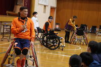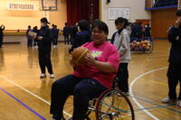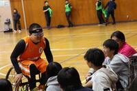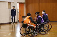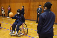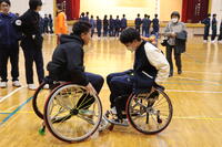 後半は函館元町ライオンズEBC「ハダーズ」の皆様をお招きし、車いすバスケットボールの体験を行いました。競技用の車いすと普段使う車いすとの違いを学び、実際にボールを使ってプレーするなど、生徒たちにとっては新しい発見の連続でした。最後にはミニマッチも行い、選手の皆さんのスピードに驚きながらも、一生懸命に車いすを動かしていました。