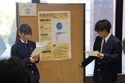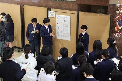 大ホールでの発表のあと、ロビーでは高校1年生によるポスターセッションが行われました。町をよくするための高校生の気づきや方策を伝えることができました。